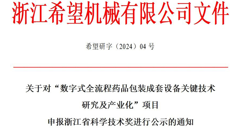 關(guān)于對“數(shù)字式全流程藥品包裝成套設(shè)備關(guān)鍵技術(shù)研究及產(chǎn)業(yè)化”項目 申報浙江省科學(xué)技術(shù)獎進(jìn)行公示的通知